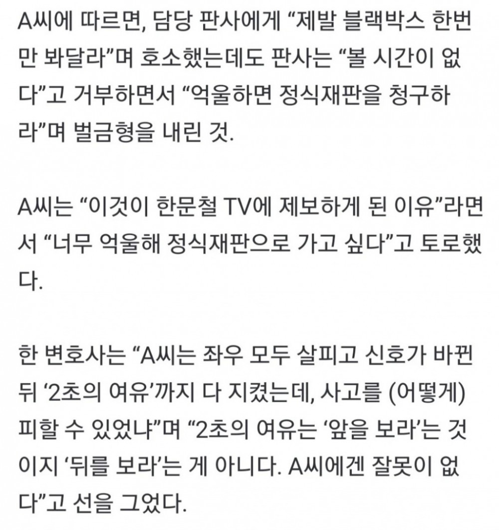 한 변호사는 해당 판사를 향해 “36초 볼 시간이 없어서라니 참나, 판사님 즉결심판 받으러 오기까지 얼마나 시간이 오래 걸리고 스트레스 많이 받았겠냐. 제발 블랙박스 1분만 봐달라”고 목소리를 높였다.