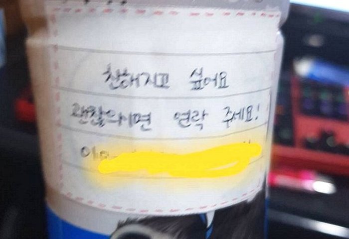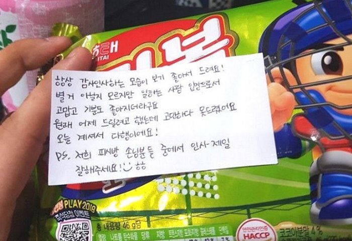 공개된 사진에는 "항상 감사인사하는 모습이 보기 좋아서 드린다"라는 쪽지가 과자에 붙어있다.