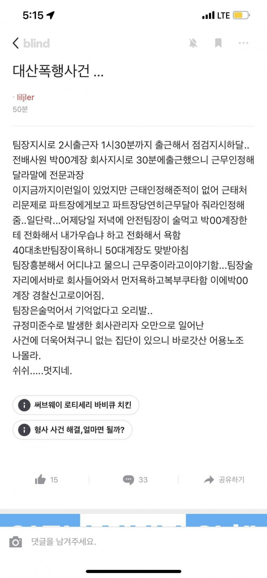 팀장이 계장 보디블로. 해임으로 끝내려는분위기